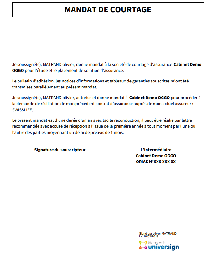 Depuis 2014 les emprunteurs ont la possibilité de résilier leur assurance de prêt dans le délai dun an à compter de loffre de prêtPour faciliter ces démarches AS Courtage courtier. Le mandant c onfi e dès c e j our à l a s oc i été s us menti onnée l e mandat ex c l us i f de tr ai ter et de gér er toutes l es ques ti ons r el ati v es au s ui v i à l a modi fi c ati on des pol i c es d as s ur anc es du c l i ent s us menti onné. Pour les intermédiaires exerçant sous mandat vous trouverez ci-après un modèle dattestation de mandat.